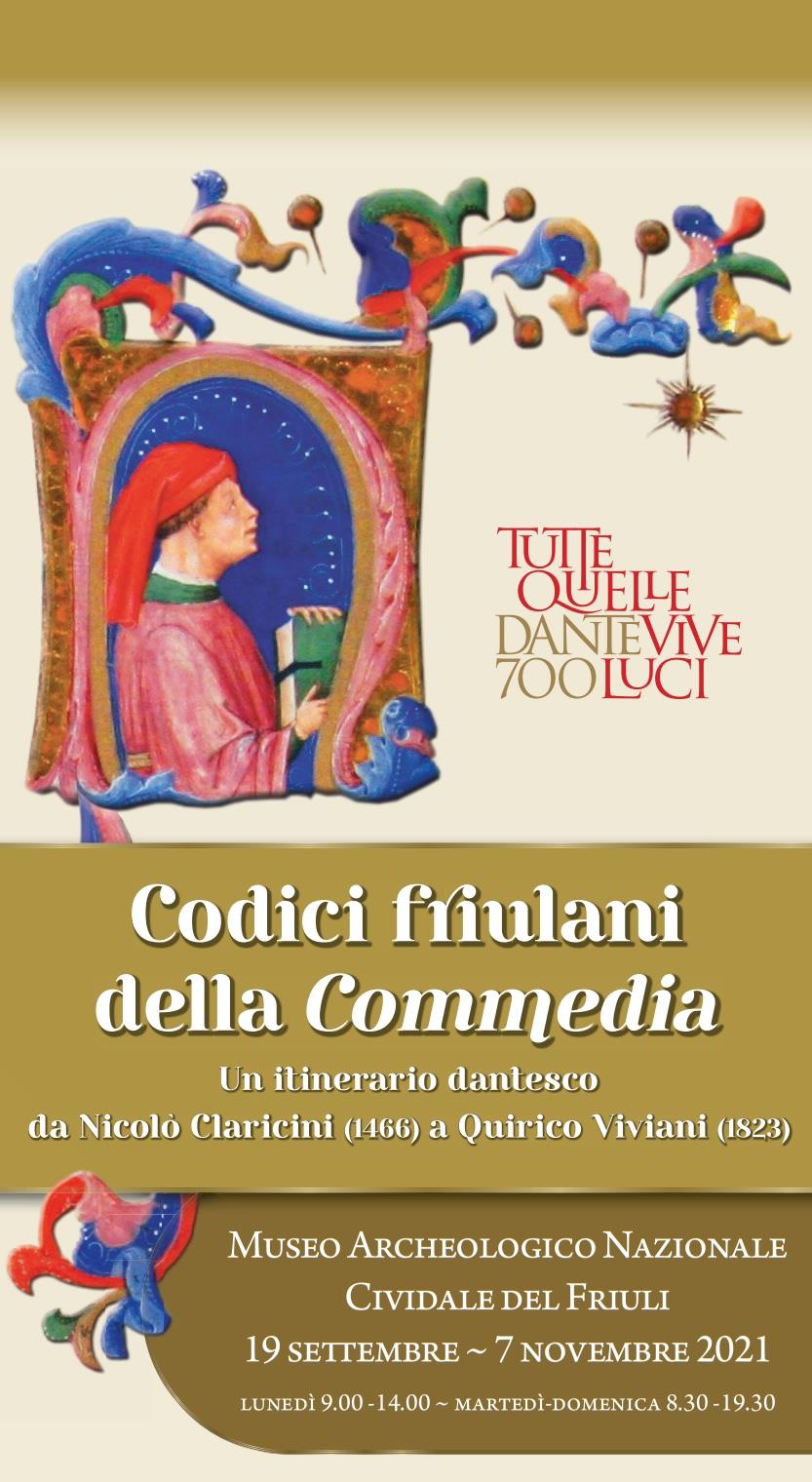 La mostra riunisce per la prima volta in un medesimo spazio espositivo alcuni codici della Commedia: quello un tempo proprietà della famiglia de Claricini, unico provatamente copiato in Friuli e altri quattro codici pervenuti in Friuli in varie epoche, attualmente custoditi in collezioni librarie pubbliche o private. Al nucleo dei codici danteschi, sono affiancati alcuni manoscritti copiati in Friuli e connessi variamente con il poema dantesco, i quali anch’essi, pur indirettamente, ne testimoniano la diffusione e la lettura. Obiettivo principale è di documentare e far conoscere al vasto pubblico la fortuna e l’incidenza che l’opera di Dante ebbe nella cultura friulana tardo medievale, moderna e contemporanea.