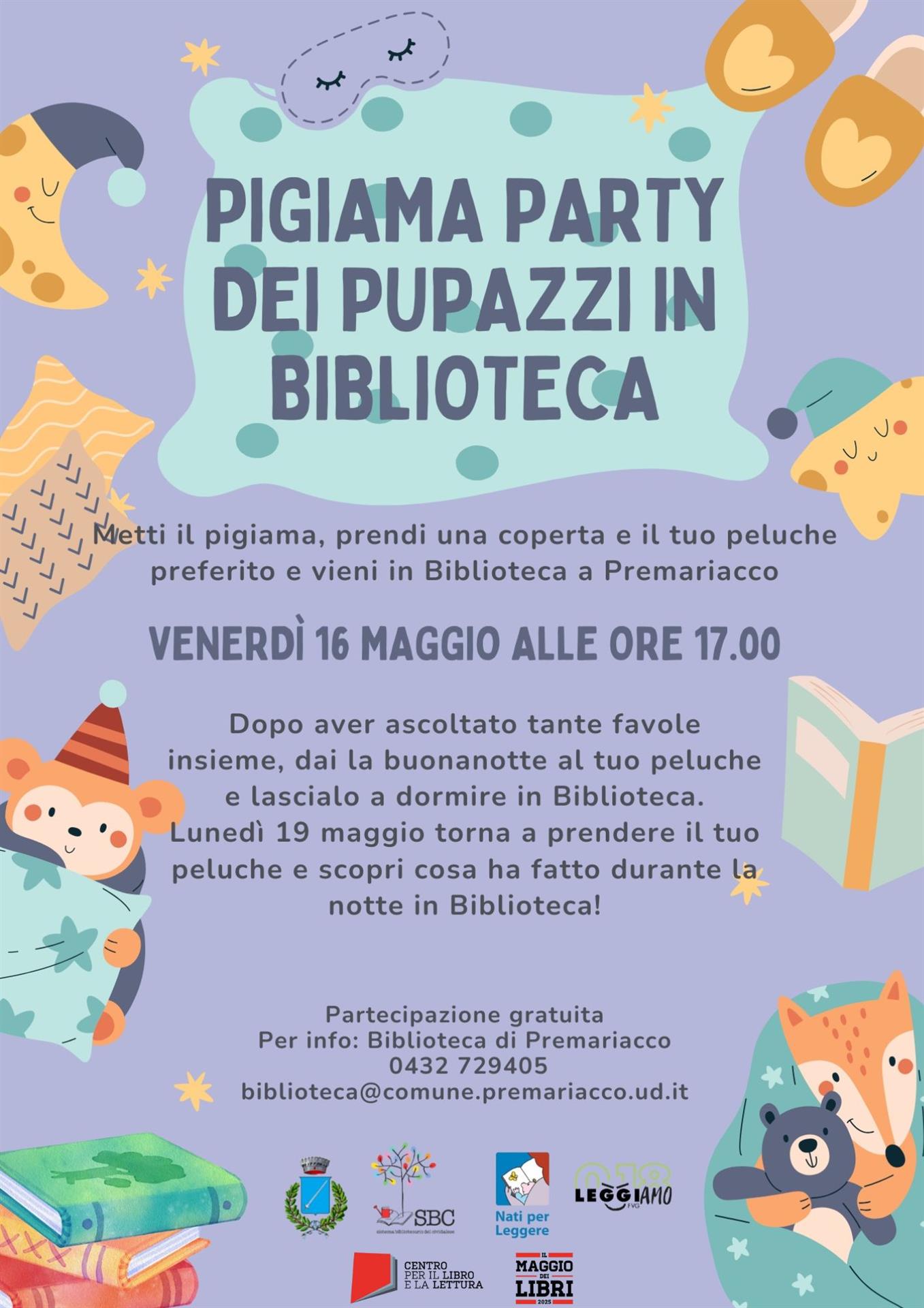 Metti il pigiama, prendi una coperta e il tuo peluche preferito e vieni in Biblioteca a Premariacco venerdì 16 maggio alle ore 17:00.