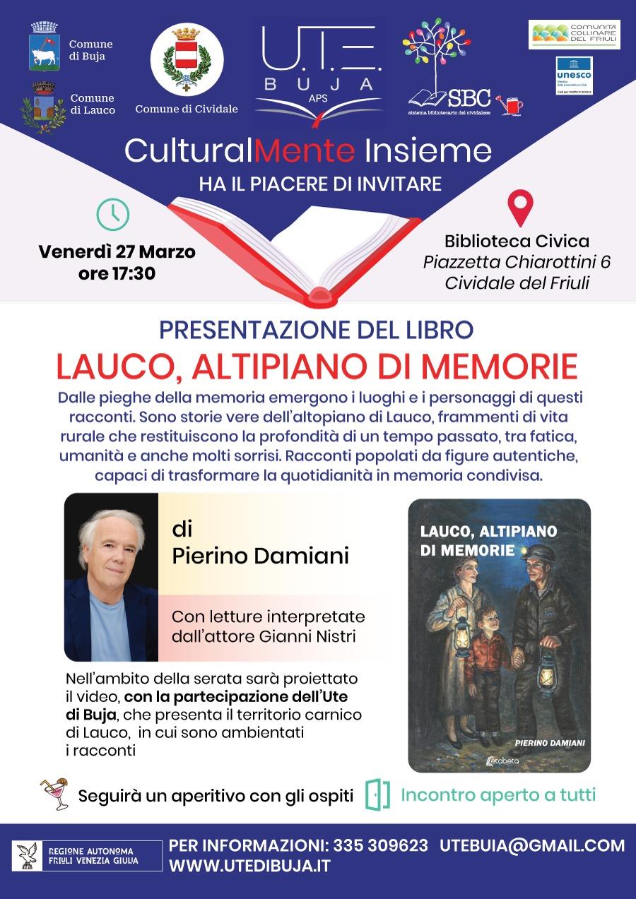 Pierino Damiani presenta il libro Lauco, altipiano di memorie venerdì 27 marzo 2026 alle ore 17.30 presso la Biblioteca civica di Cividale del Friuli.